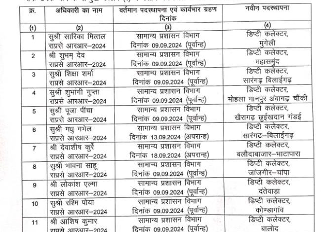 छत्तीसगढ़ में 13 डिप्टी कलेक्टरों को मिली नियुक्ति, सामान्य प्रशासन विभाग ने जारी किया आदेश, देखें लिस्ट
