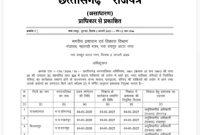 रायपुर। नगरीय प्रशासन विभाग ने निगमों के बाद सभी पालिका परिषदों में भी प्रशासक नियुक्त कर दिए हैं । सभी जगह एसडीओ राजस्व को प्रशासक बनाया गया है।