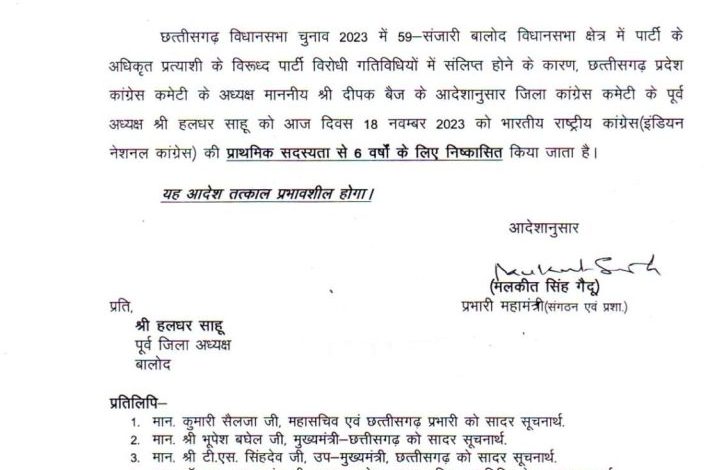 CG BREAKING : कांग्रेस ने पूर्व जिला अध्यक्ष को 6 साल के लिए किया निष्कासित, पार्टी विरोधी गतिविधि में थे शामिल