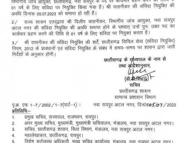 CG BREAKING : रिटायर्ड IAS दिलीप वासनीकर का बढ़ा कार्यकाल, विभागीय जांच आयुक्त के रूप में मिली एक साल की सेवावृद्धि, आदेश जारी…