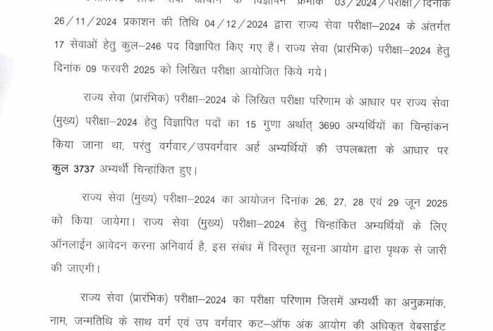 प्रीलिम्स परीक्षा में सफल होने वाले अभ्यर्थी अब मुख्य परीक्षा (मेंस) में शामिल होंगे। आयोग ने मेंस परीक्षा की तिथि 26, 27, 28 और 29 जून 2025 निर्धारित की है। चयनित उम्मीदवारों को मेंस परीक्षा के लिए अलग से आवेदन करना होगा, जिसके संबंध में जल्द ही अधिसूचना जारी होगी।