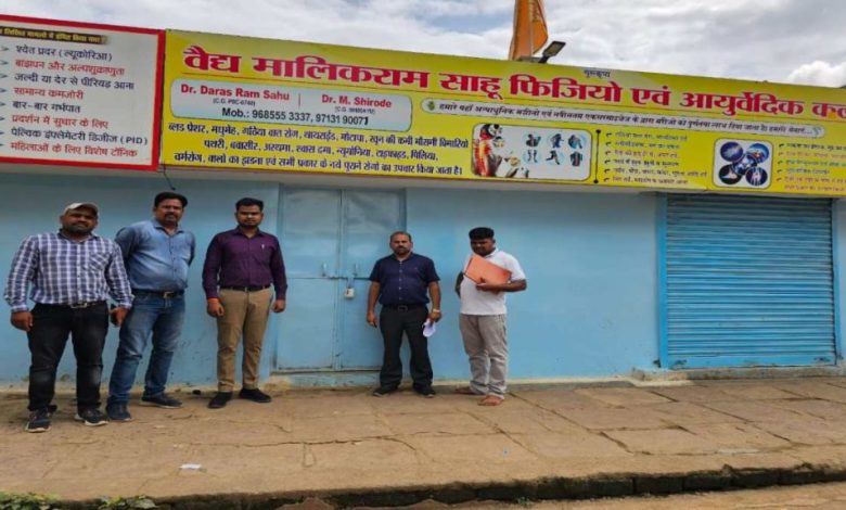 बिलासपुर के चांटीडीह स्थित शिव कुमार धुरी के क्लीनिक का निरीक्षण किया गया. क्लीनिक संचालक शिव कुमार धुरी ने एलोपैथी दवाईयां, इंजेक्शन रखने और इलाज करने संबंधी कोई भी दस्तावेज प्रस्तुत नहीं किया. इसके कारण क्लीनिक को सील किया गया. सेंदरी में पलाश कुमार राय के क्लिनिक में जांच की गई. चिकित्सा किए जाने संबंधी कोई भी प्रमाणित वैध अनुमति के दस्तावेज नहीं पाए जाने पर क्लिनिक सील किए जाने की कार्रवाई की गई. ग्राम सेमरताल में प्रसंजीत मलिक एवं ग्राम सेमरा में दरसराम साहू और पुष्पा साहू के क्लीनिक की जांच की गई. चिकित्सा किए जाने संबंधी कोई भी प्रमाणित दस्तावेज नहीं पाए जाने पर क्लीनिक सील करने की कार्रवाई की गई. ग्राम देवरीखुर्द में बंगाली क्लीनिक का अवैध रूप से संचालित करने पर क्लीनिक को सील कर दिया गया. इसी तरह सरकंडा इमलीमाठा में अवैध क्लीनिक सील की गई.