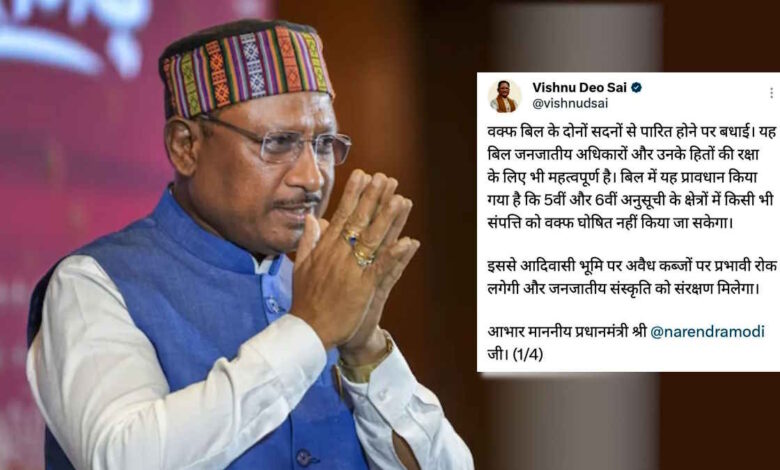 मुख्यमंत्री विष्णु देव साय ने सोशल मीडिया पोस्ट एक्स पर किए अपने पोस्ट में प्रधानमंत्री नरेंद्र मोदी का आभार जताते हुए लिखा है कि वक्फ बिल के दोनों सदनों से पारित होने पर बधाई. यह बिल जनजातीय अधिकारों और उनके हितों की रक्षा के लिए भी महत्वपूर्ण है. बिल में यह प्रावधान किया गया है कि 5वीं और 6वीं अनुसूची के क्षेत्रों में किसी भी संपत्ति को वक्फ घोषित नहीं किया जा सकेगा. इससे आदिवासी भूमि पर अवैध कब्जों पर प्रभावी रोक लगेगी और जनजातीय संस्कृति को संरक्षण मिलेगा.
