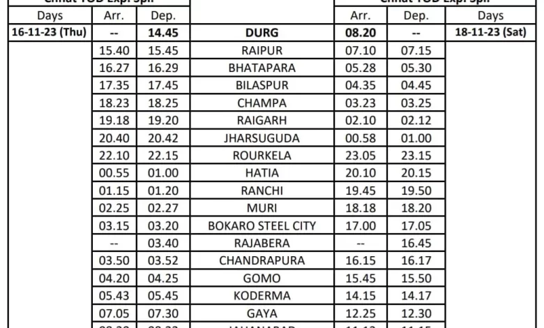 इसी प्रकार यह ट्रेन 0802 नंबर के साथ दिनांक 17/11/2023 (शुक्रवार) को प्रातः 10.30 बजे पटना स्टेशन से दुर्ग के लिए प्रस्थान करेगी । यह ट्रेन जहानाबाद, गया, कोडरमा, गोमो, चंद्रपुरा, बोकारो, मुरी, रांची, हटिया, राउरकेला स्टेशन होते हुए झारसुगुड़ा आगमन 00.58 बजे एवं प्रस्थान 00.10 बजे (18/11/2023), रायगढ़ आगमन 02.10 बजे एवं प्रस्थान 02.12 बजे, चाम्पा आगमन 03.23 बजे एवं प्रस्थान 03.25 बजे, बिलासपुर आगमन 04.35 बजे एवं प्रस्थान 04.45 बजे, भाटापारा आगमन 05.28 बजे एवं प्रस्थान 05.30 बजे, रायपुर आगमन 07.10 बजे एवं प्रस्थान 07.15 बजे एवं दिनांक 18/11/2023 (शनिवार) को दुर्ग स्टेशन पहुंचेगी। इस गाड़ी में कुल 22 कोच उपलब्ध रहेंगी ।