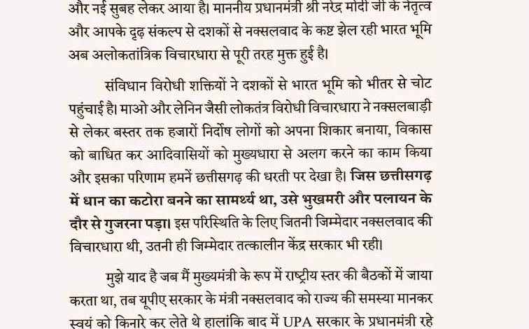 उन्होंने यह भी कहा कि अब छत्तीसगढ़ समेत पूरा देश नक्सलवाद जैसी लोकतंत्र विरोधी विचारधारा से मुक्त होकर विकास की नई दिशा में आगे बढ़ेगा। प्रधानमंत्री नरेंद्र मोदी के नेतृत्व में देश में विकास की नई बयार बहने की बात भी पत्र में कही गई है।