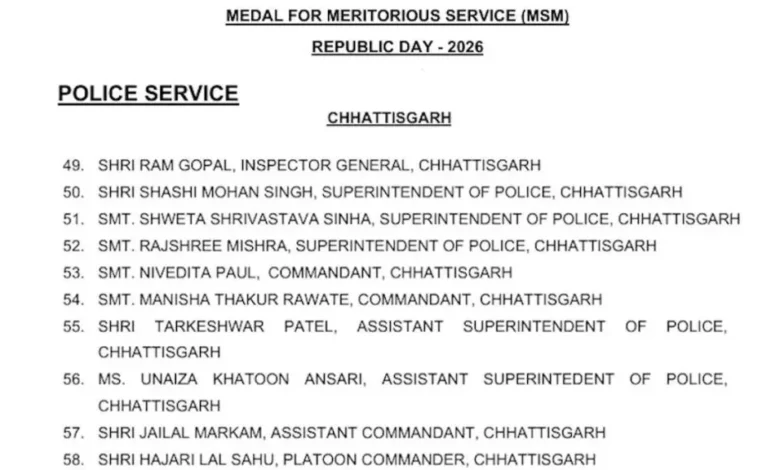 गणतंत्र दिवस के पावन अवसर पर छत्तीसगढ़ पुलिस के लिए यह गर्व का क्षण है। गृह मंत्रालय भारत सरकार ने राज्य के 10 उत्कृष्ट पुलिस अधिकारियों का चयन मेडल फॉर मेरिटोरियस सर्विस (MSM) के लिए किया है। इन सभी अधिकारियों को यह प्रतिष्ठित सम्मान राष्ट्रपति द्रौपदी मुर्मु द्वारा प्रदान किया जाएगा।