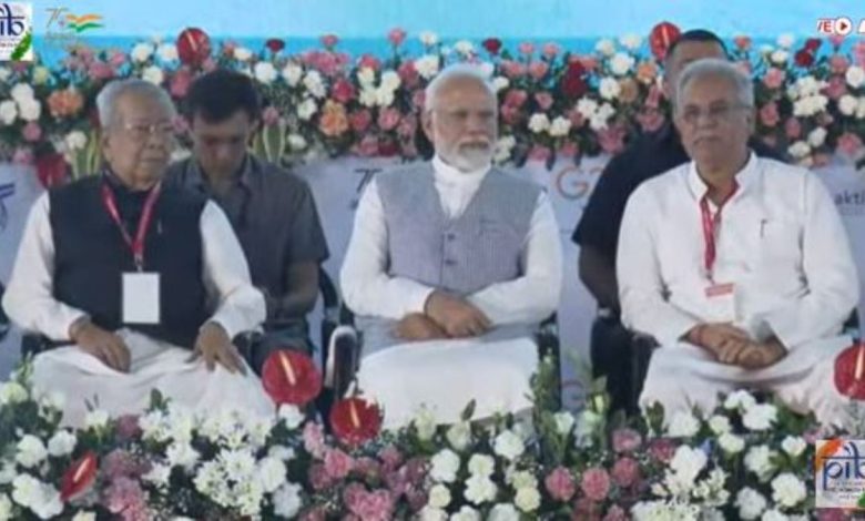 रायपुर. प्रधानमंत्री नरेंद्र मोदी साइंस कॉलेज मैदान पहुंच चुके हैं. शासकीय कार्यक्रम की शुरुआत हो चुकी है. पीएम मोदी ने प्रदेश को 7600 करोड़ रुपये की सौगात दी. इस दौरान मंच पर पीएम मोदी समेत राज्यपाल विश्वभूषण हरिचंदन, सीएम भूपेश बघेल, केंद्रीय मंत्री नितीन गडकरी, डिप्टी सीएम टीएस सिंदेव, पूर्व सीएम रमन सिंह, सांसद सुनील सोनी, बीजेपी प्रदेश अध्यक्ष अरुण साव समेत अन्य नेतागण मौजदू हैं.