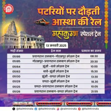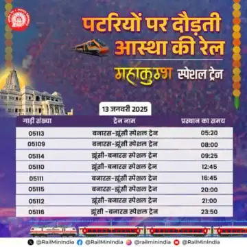 13 जनवरी को संचालित होने वाली ट्रेनों और उनकी टाइमिंग पर नजर डालें, तो बनारस से झूंसी रेलवे स्टेशन के लिए स्पेशल ट्रेन (05113-05109), झूंसी से बनारस स्पेशल ट्रेन (05114-05110), प्रयागराज रामबाग से बनारस और बनारस से प्रयागराज रामबाग के लिए (05108-05105), गोरखपुर से झूंसी स्टेशन के लिए और झूंसी से गोरखपुर के लिए (05179-05178), इसके अलावा बिहार के छपरा से प्रयागराज आने और यहां से जाने के लिए (051125-051126) ट्रेन का संचालन किया जा रहा है.
