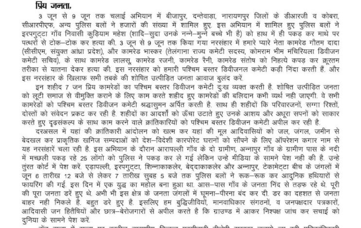 देखें नक्सलियों द्वारा जारी किया गया प्रेस नोट: